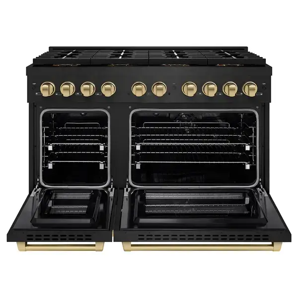 The ZLINE Autograph Edition 48-inch Paramount Dual Fuel Range elevates kitchen performance and style with a powerful 8-burner DuoPro™ cooktop, generous 6.7 cu. ft. dual oven capacity, and a striking black stainless steel finish accented with champagne bronze details. Designed for both everyday family meals and gourmet cooking, this professional-inspired range offers electric convection baking, continuous cast-iron grates, precise heat control, and rugged construction that delivers lasting reliability in a standout modern package.